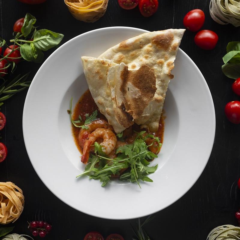 Krewetki / pomidor / białe wino / papryczki / olio Extra Vergine di Oliva / peperoncino / czosnek / cebula